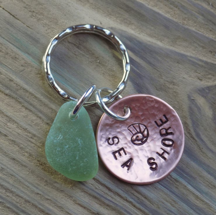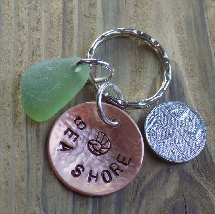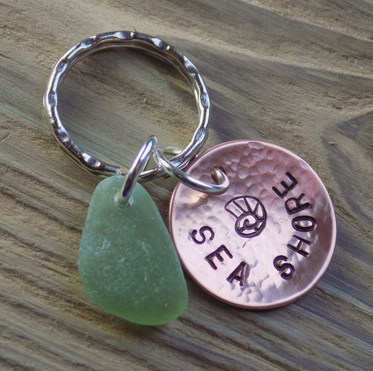 Sea glass and stamped copper keyring.