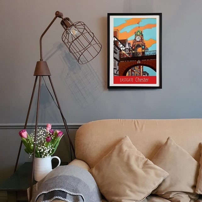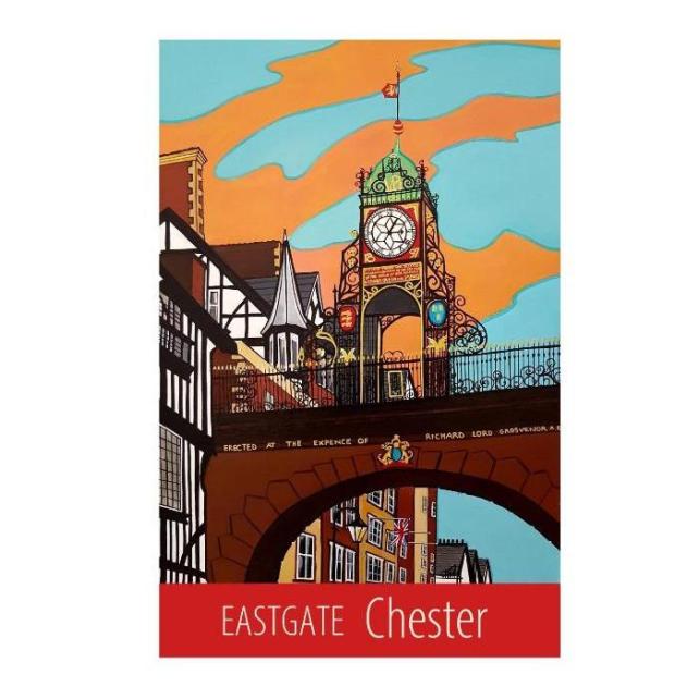 A contemporary travel poster style print of historic Chester's Eastgate and its ornate clock at sunset, from my own original acrylic painting.