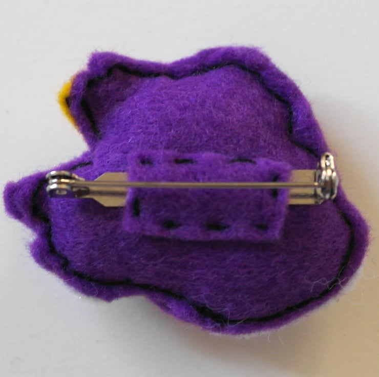 Hand cut, hand sewn using felt materials, with cotton thread and stuffed using polyester stuffing. On the back is attached a sliver colored brooch pin.