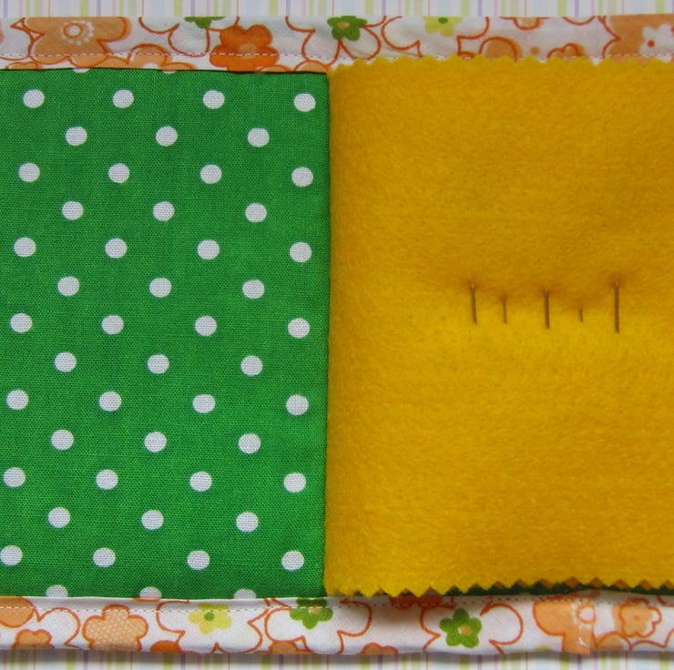 Edged with orange floral bias binding and backed with green and white polka dot fabric.