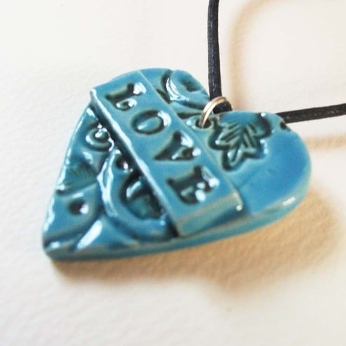 This cute little heart pendant is made from white earthenware clay and embossed with a lovely leafy background. In the foreground is the word "LOVE"