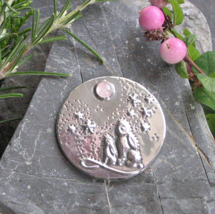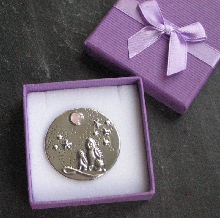 Brooch handmade in pewter with a design of moon-gazing hares. This shiny brooch has been inspire by "I love you to the Moon and back" and depicts a big and little hare gazing up at a moon of rose quartz.