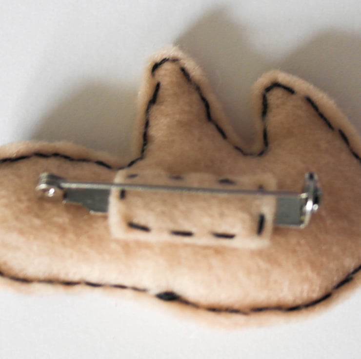 Hand cut, hand sewn using felt materials, with cotton thread and stuffed using polyester stuffing. On the back is attached a lockable brooch pin.
