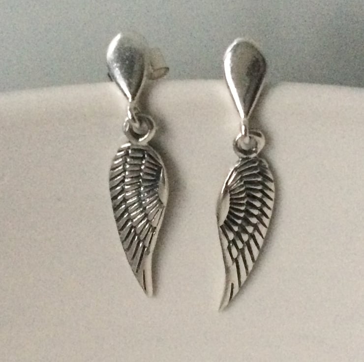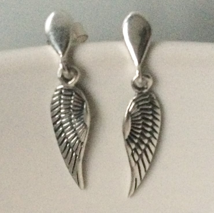 Sterling Silver Angel Wing Charm Stud Dangle Earrings - Everyday earrings made with Sterling Silver Angel Wing Charms attached to Sterling Silver Teardrop Studs.