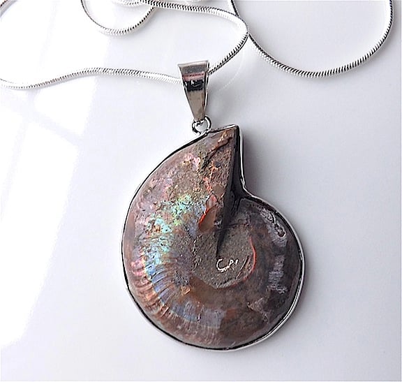 Ammonite, sliced fossil pendant, gem stone size 40 mm X 32 mm ( 4 X 3.2 cm ) depth of 8 mm ( 0.8 cm ) snake chain necklace lengths available 18, 20 or 24 inches ( 46, 51 and 61 cm ) with lobster clasp fastening, edge finish, chain and fastening 925 silver. Can be supplied with choice of necklace lengths, please let me know when ordering which you would like. ( subject to availability ) The last image is the iridescent back of the pendant.