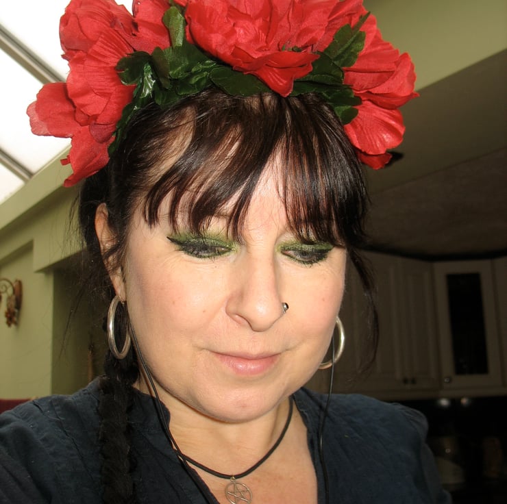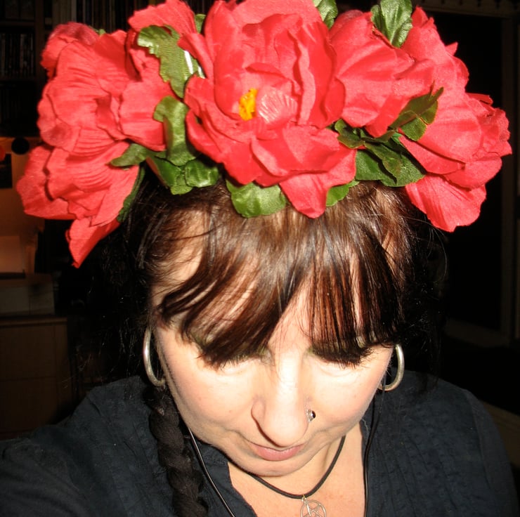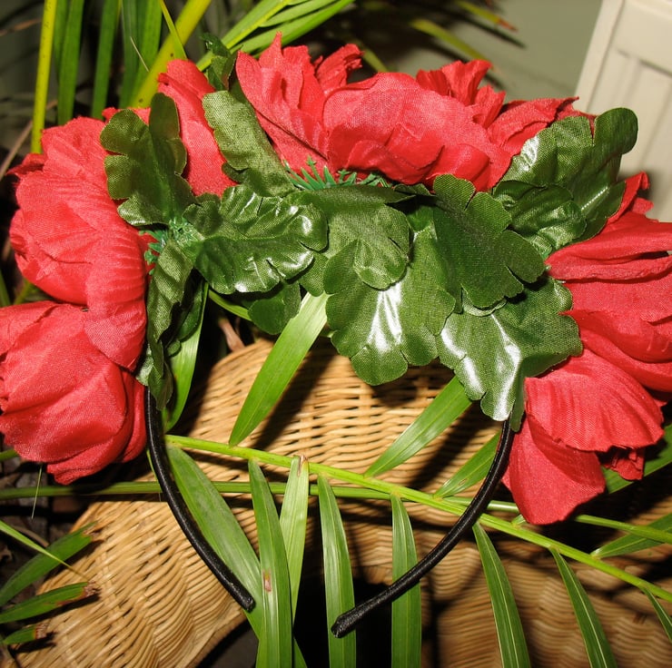 This pretty little headband headdress is made with artificial red anemones and green leaves, attached to a small black satin headband. This is a statement piece that won't break the bank!