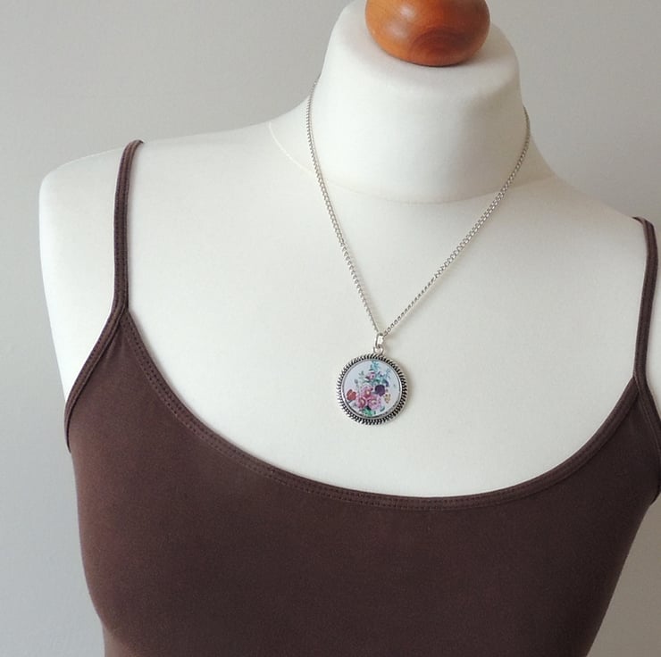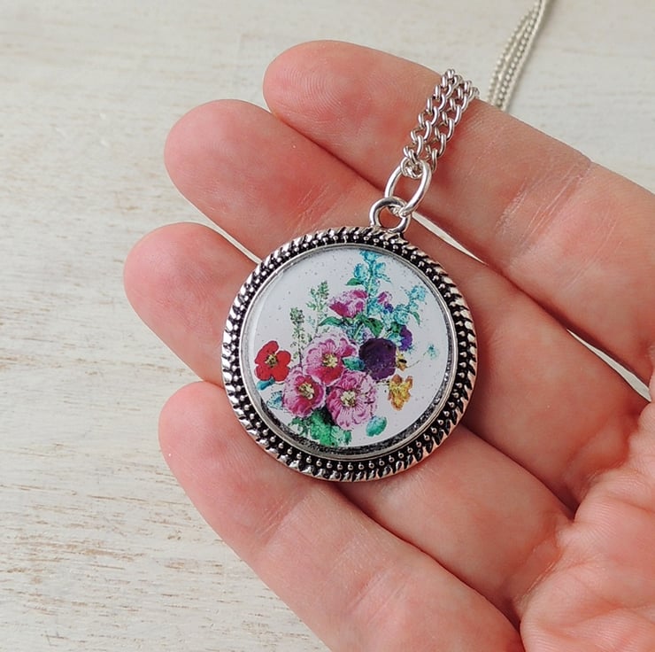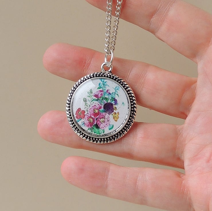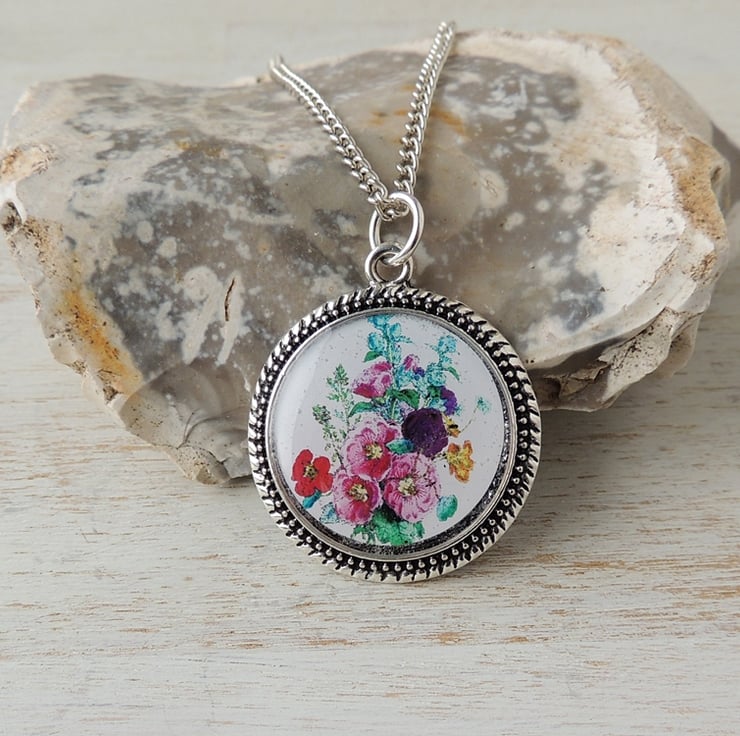 I made it with an image of a vintage illustration of Hollyhocks that has been set into a silver plated pendant bezel and sealed with a coat of clear resin.
