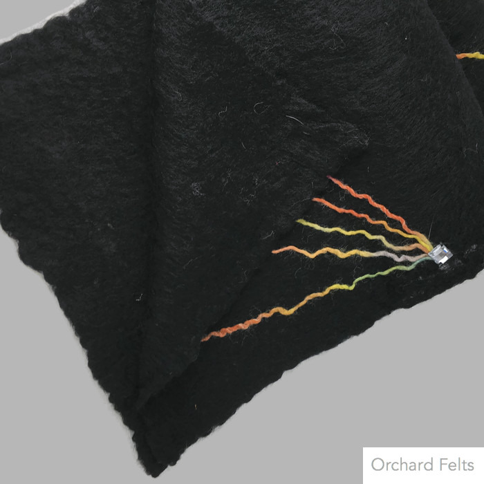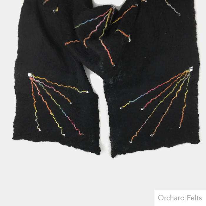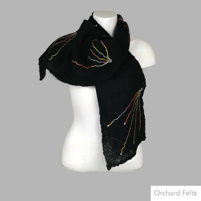 A gorgeously soft black merino wool scarf which has been hand felted using fine layers of wool to give a lightweight, sheer scarf. A star burst pattern using a multicoloured woollen yarn has been added to one side, prior to felting, as decoration. Acrylic gems and silver sequins have been added to the add some glitz and glamour.