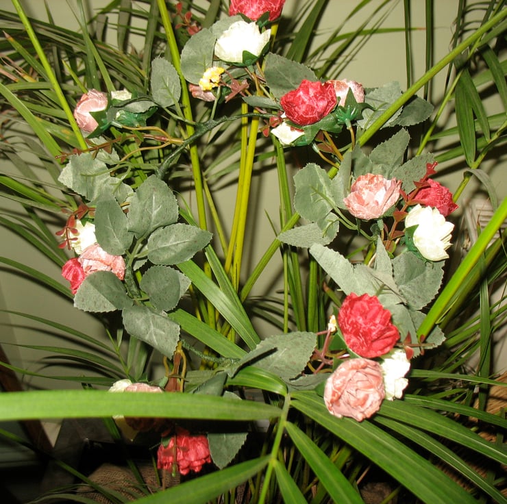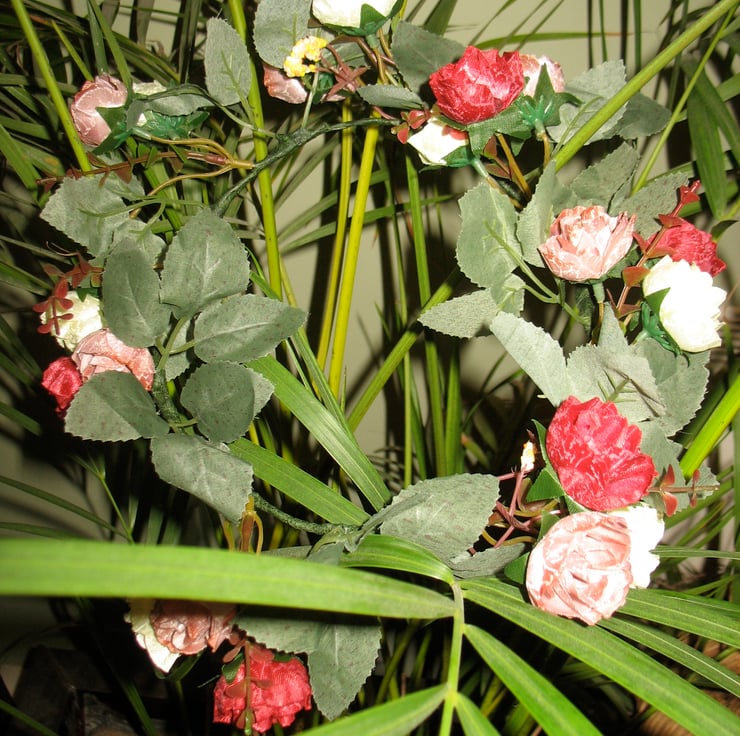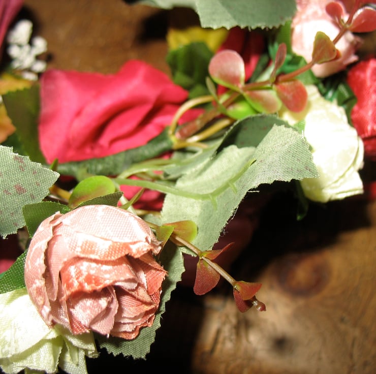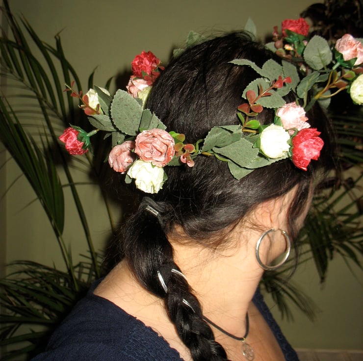This sweet and delicate headband headdress is hand twisted using artificial flowers and leaves. It's slightly smaller than the larger headdresses, so would suit a smaller adult head or a child.