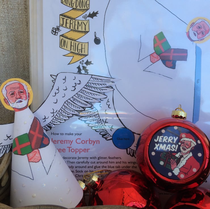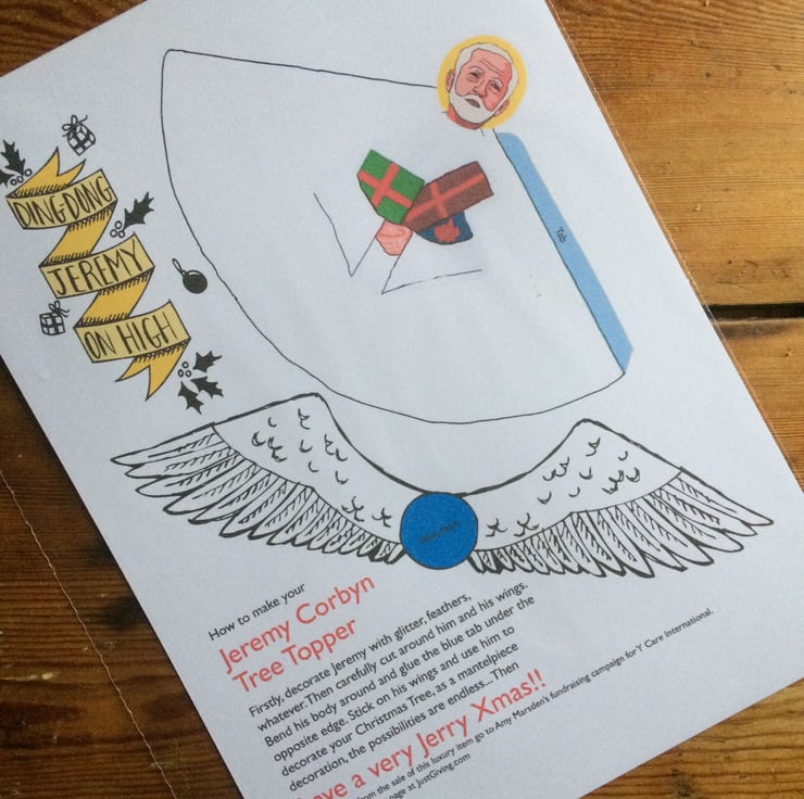 This is a fun make-it-yourself tree topper featuring non other than Jeremy Corbyn. Designed by my daughter Amy as part of a fundraising campaign for her trip to Sierra Leone, it is sure to raise a smile on any Corbynista's face! Simply decorate, cut out and glue, then put him where he should be on your Christmas tree. Printed on A4 card and posted in first class post. Just so he reaches you in time for Christmas.