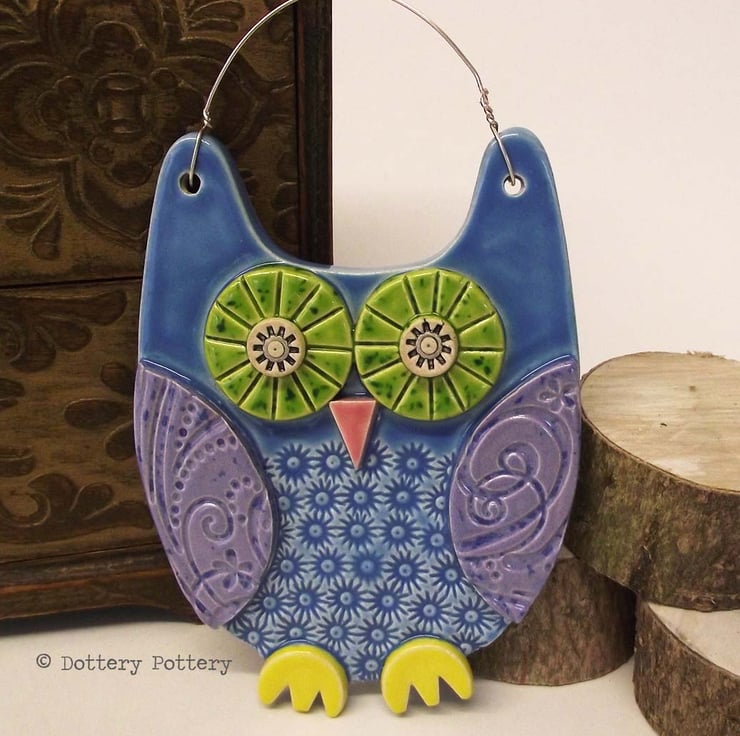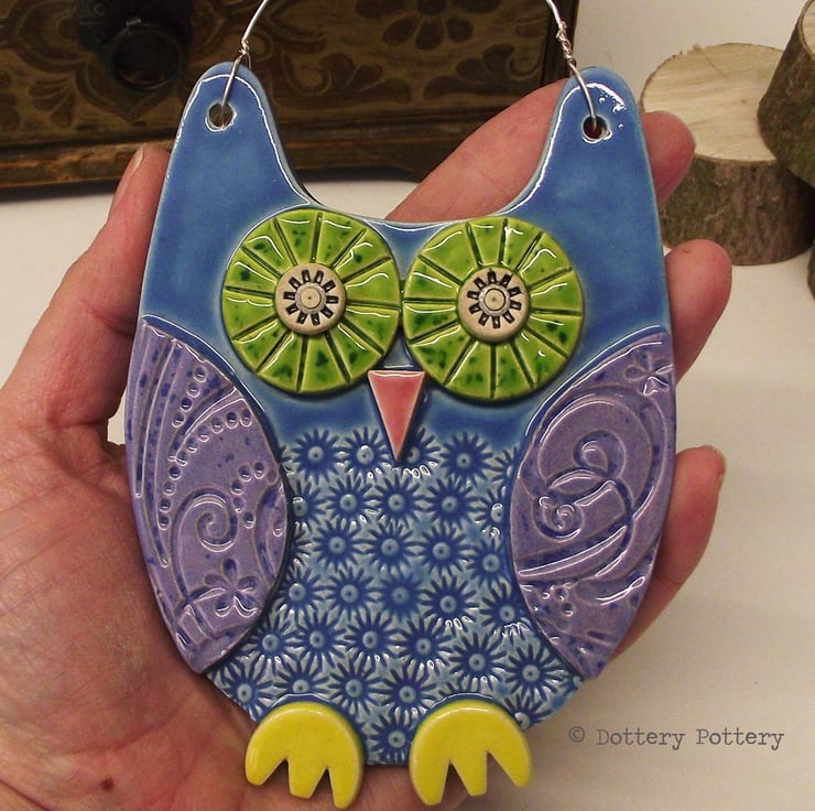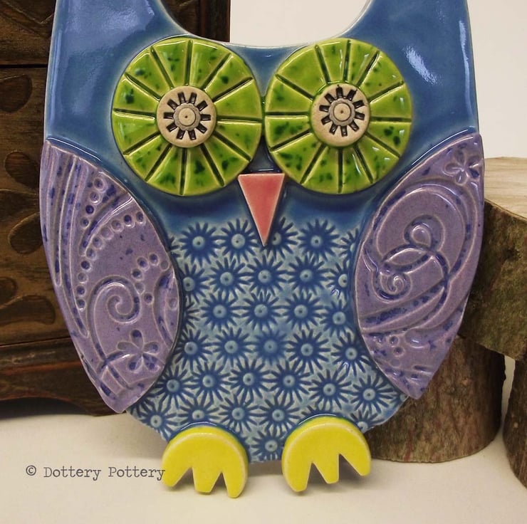 This cute ceramic owl is made from white earthenware clay with all the individual pieces hand cut and decorated with pattern.