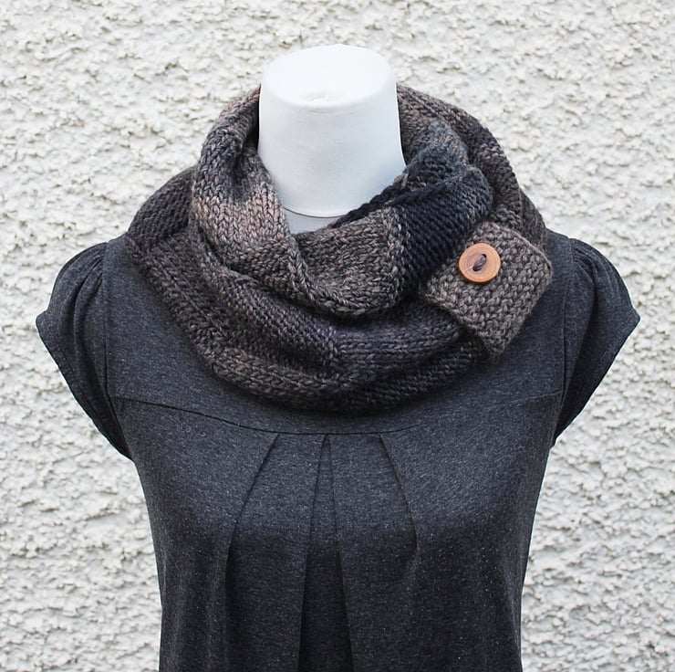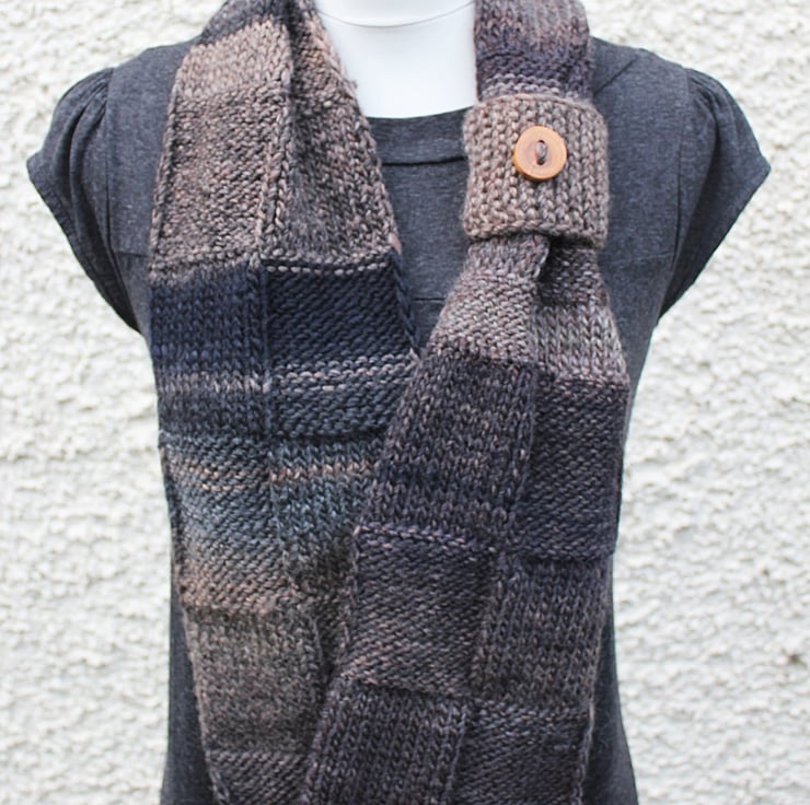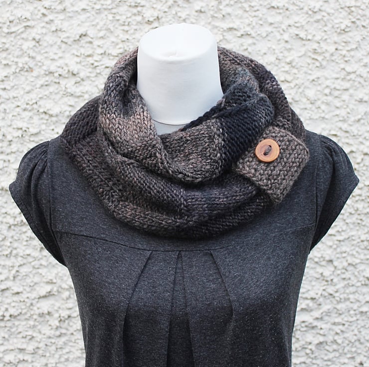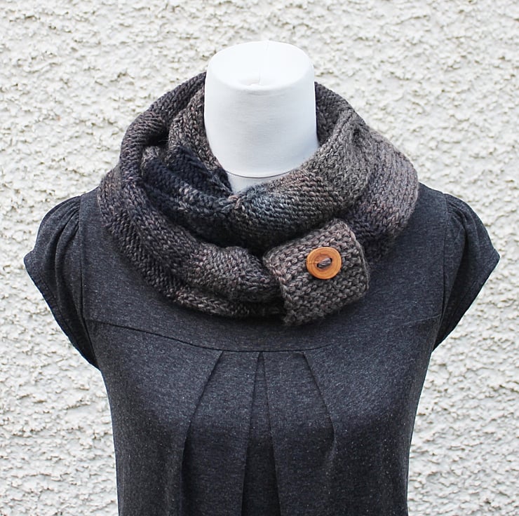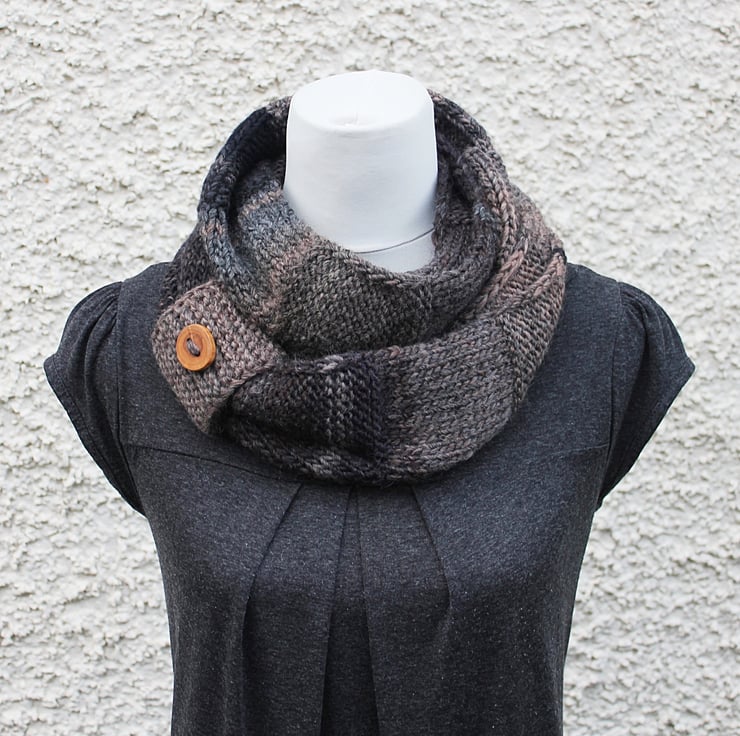 Chunky infinity scarf is hand knit out of super soft wool and acrylic blend yarn.