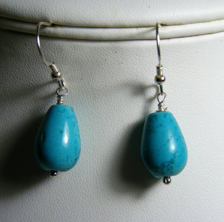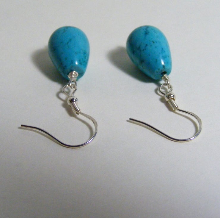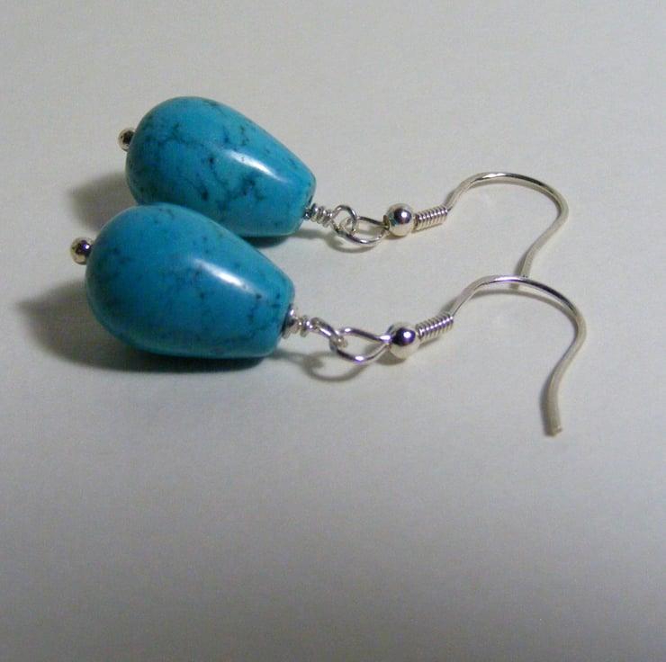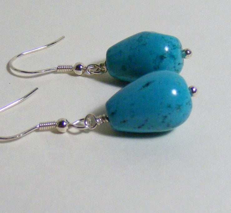 Earrings are made with 15 x 10 mm Turquoise semi precious gemstone drops which are threaded onto sterling silver ball headpins. Attached ear wire are 925 stamped sterling silver.