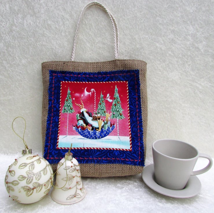 SALE, Christmas gift bag in hessian with fabric panel, penguin in umbrella