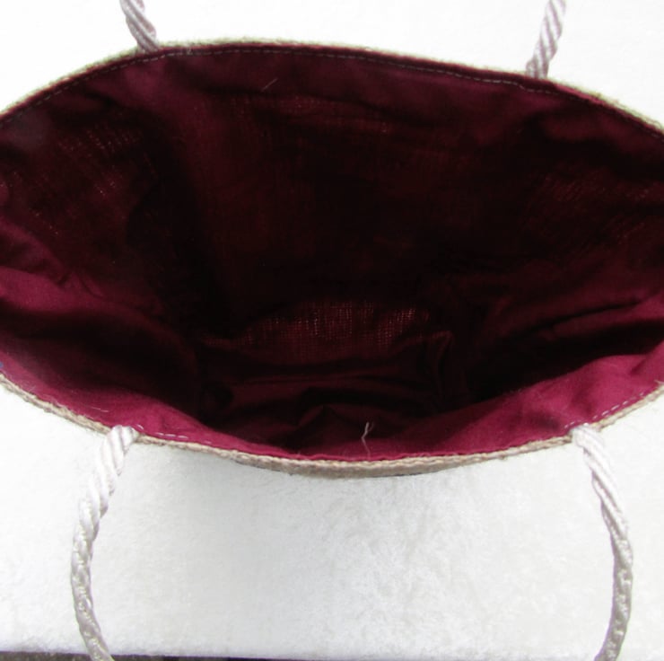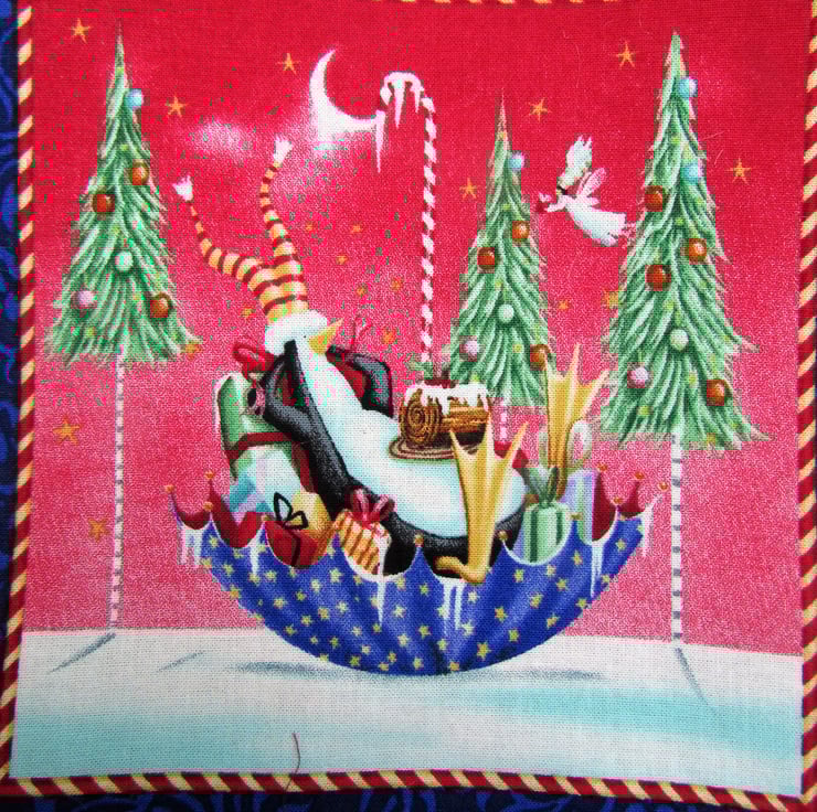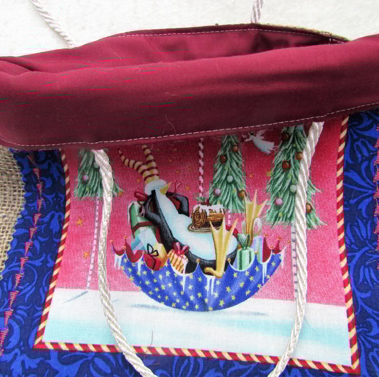 A delightful Christmas gift bag. A hessian gift bag with a fabric panel featuring a penguin wearing a hat lying in an upturned umbrella surrounded by presents and Christmas trees. The panel has scalloped edges and has been stitched around the edge with machined satin stitch in red thread in a Christmas tree pattern. The bag is fully lined with dark red fabric. The handles are cream barley twist cord.