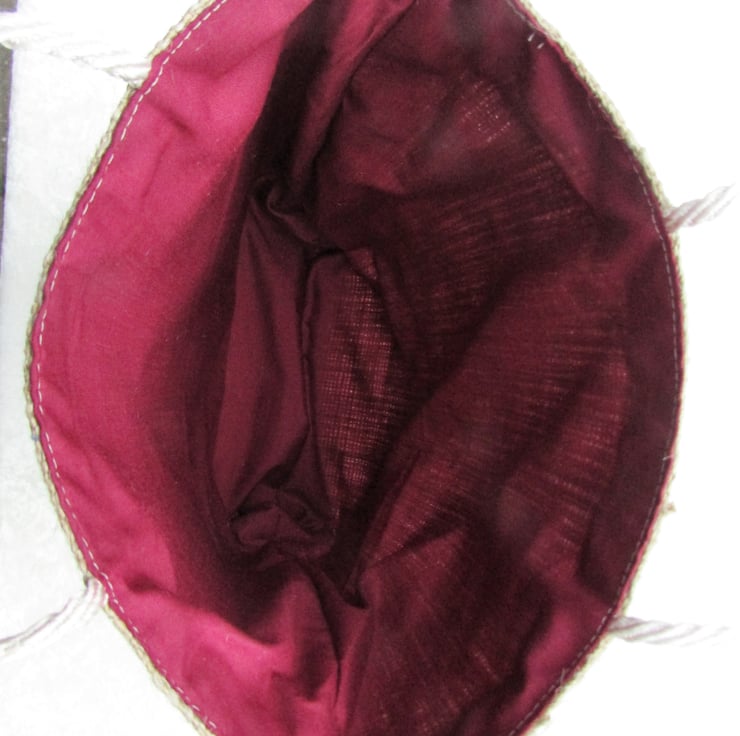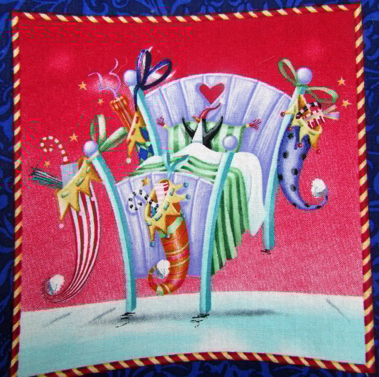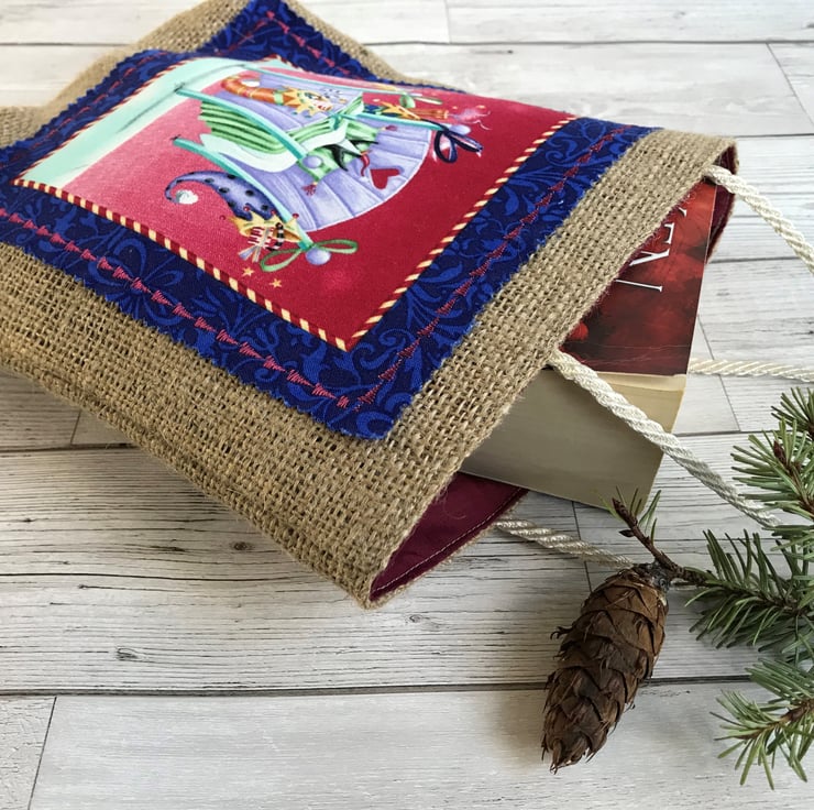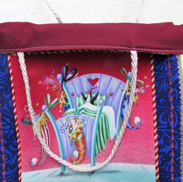 A delightful Christmas gift bag. A hessian gift bag with a fabric panel featuring a penguin in a bed with four Christmas stockings hanging from it. The panel has scalloped edges and has been stitched around the edge with machined satin stitch in red thread in a Christmas tree pattern. The bag is fully lined with dark red fabric. The handles are cream barley twist cord.