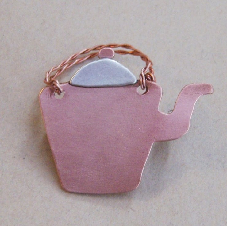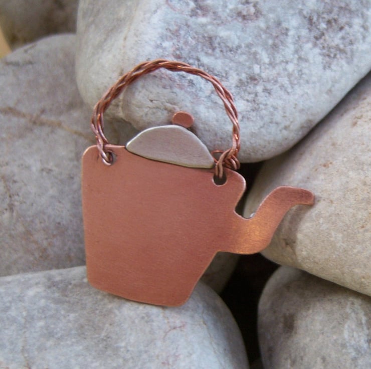 A copper kettle brooch, cut from copper sheet, with a twisted copper wire handle. Finished with a sterling silver lid and fastener. Approximately 3cms long (excluding handle) and 3.5 cms across.