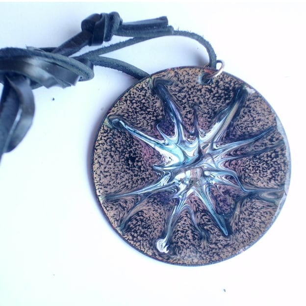This pendant measures 50mm in diameter. It is mounted on a leather thong approximately 65cm long, knotted so that you may adjust its length to suit you.