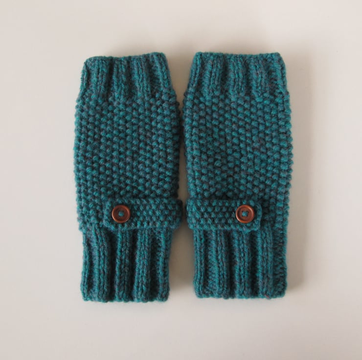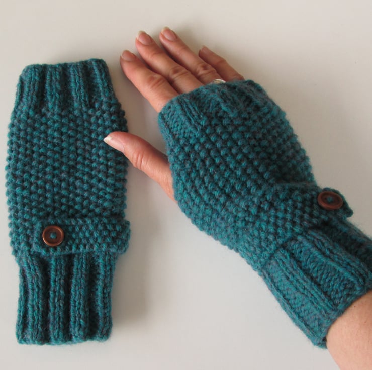These deep teal green fingerless mittens / wrist warmers / gloves are knitted in a rib and moss stitch pattern and are hand knitted in a lovely and warm Aran wool, which comprises of 25% pure wool and 75% acrylic wool.