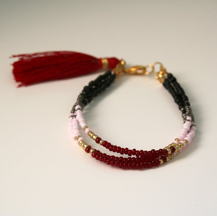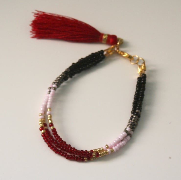 The bracelet fastens with a gold plated lobster claw clasp and is finished with a red tassel.