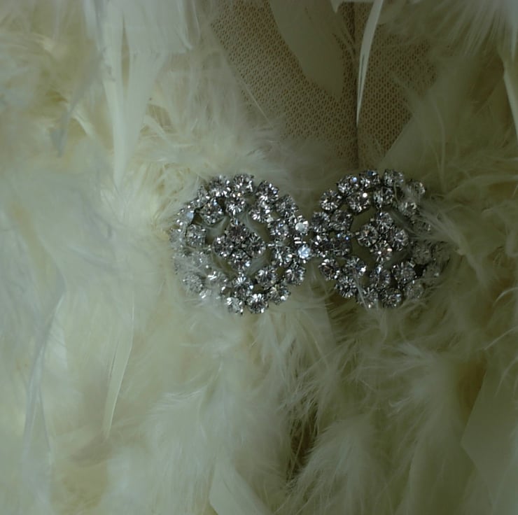 My capes are satin lined, lightly interlined (or thermally interlined for very cold winter weddings) and the feathers are painstakingly hand stitched onto an outer satin layer. The cape closes at the front with a pair of sparkly Silver and diamonte clasps for the added WOW factor!