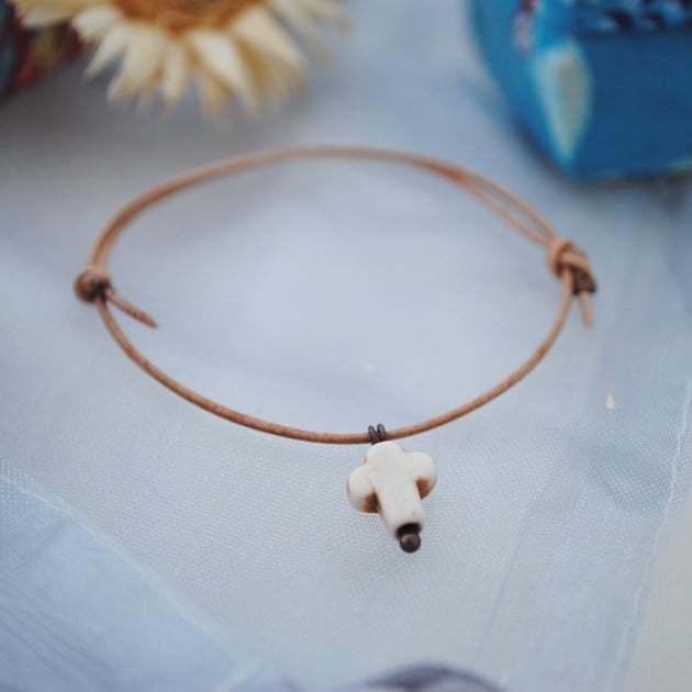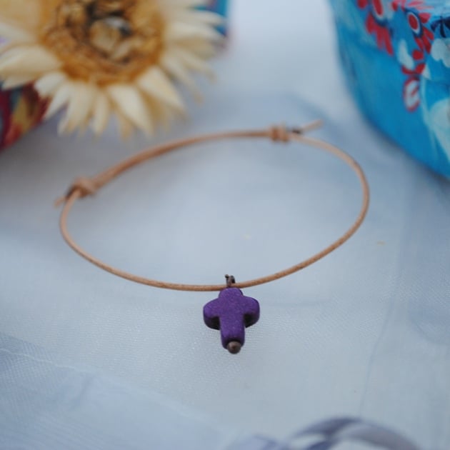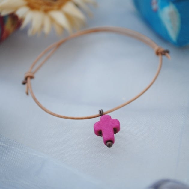 Natural leather friendship bracelet with a howlite cross charm in pink / fuchsia or white or purple or orange / red