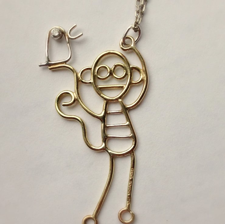 This is a solid 9ct gold pendant in the shape of a monkey with sterling silver stripes on his jumper.