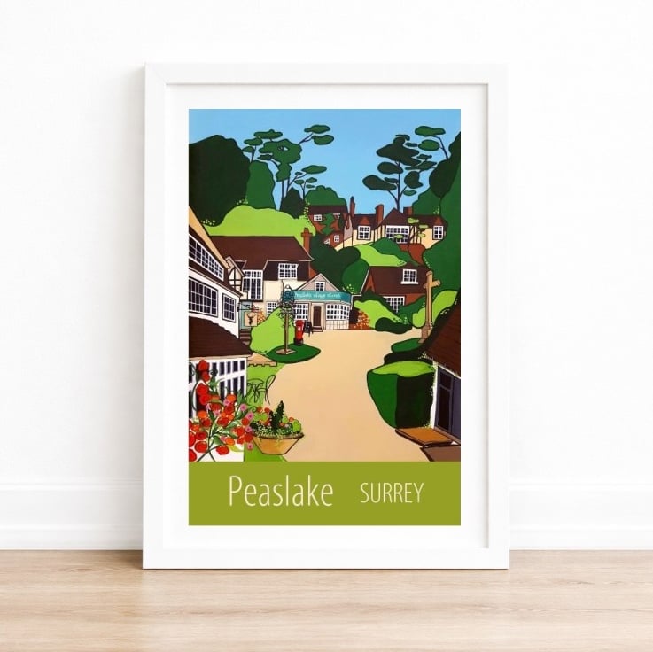 A contemporary travel poster style print of the village of Peaslake, nestled in the Surrey Hills, from my own original acrylic painting. A perfect gift for those who love Peaslake!