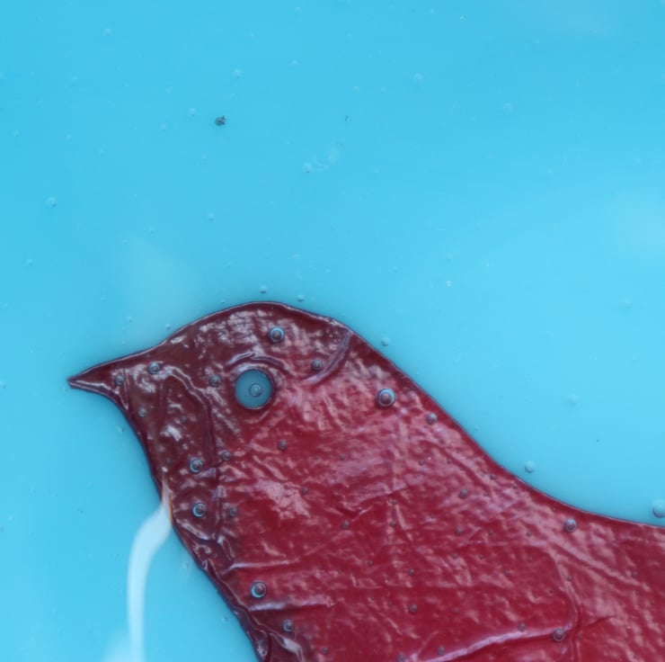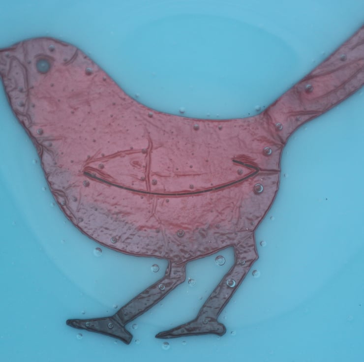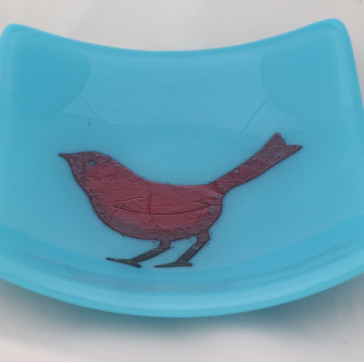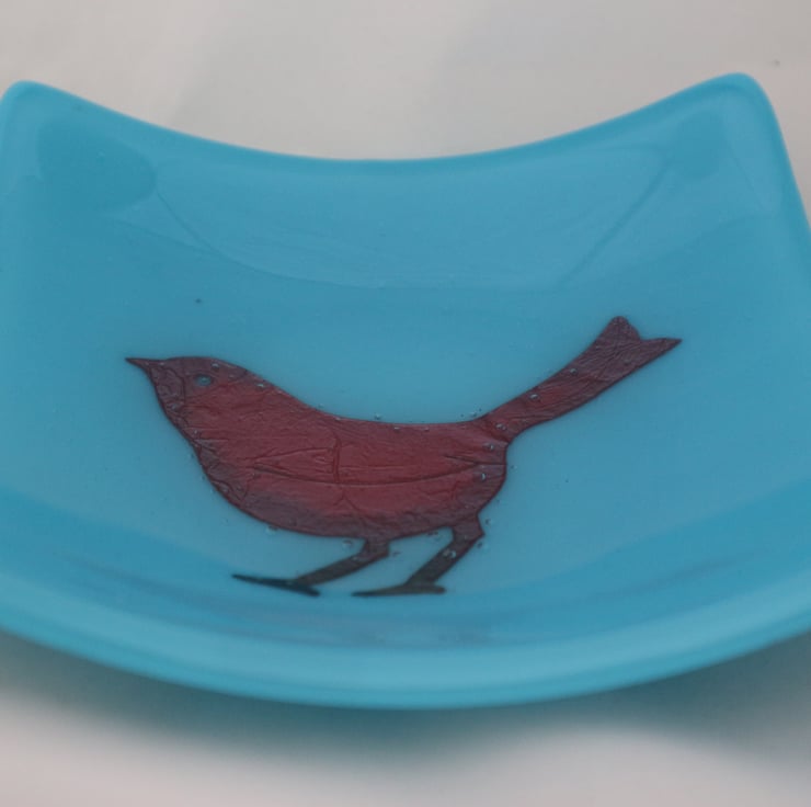 This bowl has a copper sparrow bird on opaque turquoise glass and is approximately 5 1/2 inches across. The heat has turned the middle of the copper a lovely dark matt red. The surface is glossy and smooth and the bowl looks stunning. It has been fully annealed to make it strong. This would make a great gift or treat.