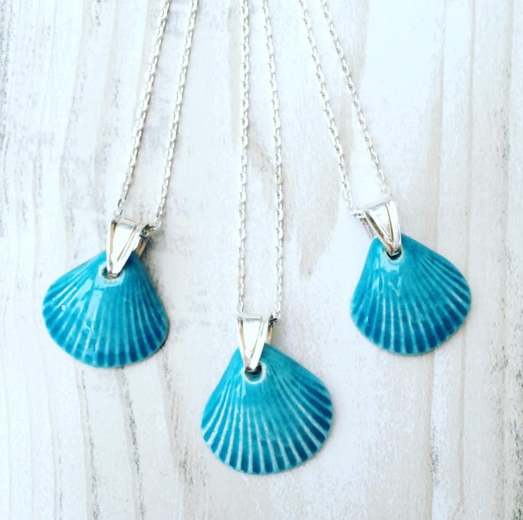 These small little shell necklaces are actually made using an a shell that I found on the beach here in Dorset. I pressed it into clay, then fired the clay which made what is called a sprig mould. I then take a ball of clay and press it into the sprig, then carefully take it out by using another ball of clay like a plunger! I pierce a hole in the top so that I can add a bail to hang the shell from. I then carefully let it dry. Once nearly completely dry I sponge off the edges. After it has dried it is then fired, glazed three times, then fired again. Quite a process but beautiful results. All my ceramics go through the same drying and glazing process.