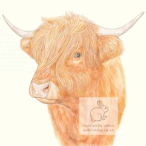Highland Cow. Print of hand drawn illustration by artist Paul Fry presented in an clear acrylic coaster (90x90mm).