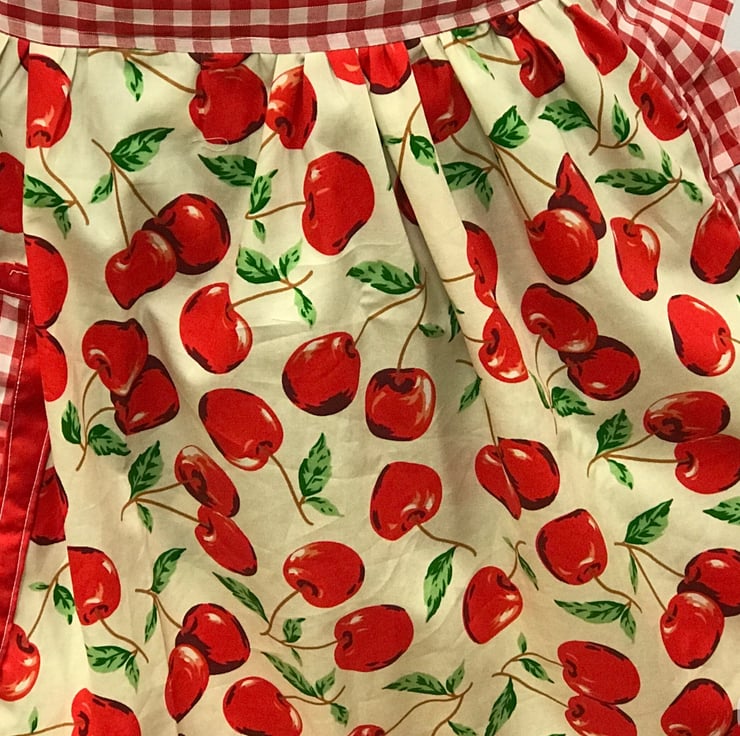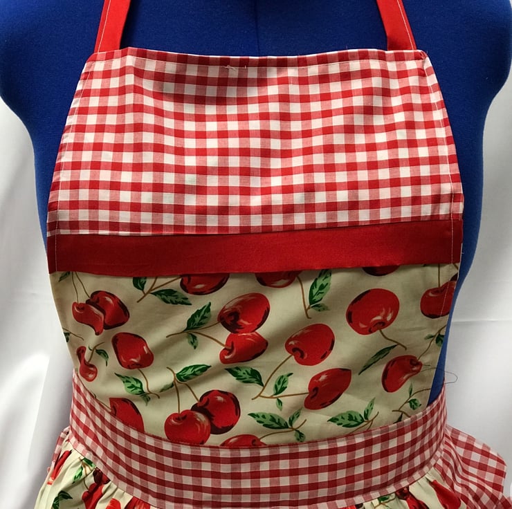 Here we have a lovely cotton rich, ivory and red (cherries pattern) with red and white gingham trim, retro style apron, handmade in house to our own design. (see photos). Adjustable neck and waist ties so will fit up to a size 22.