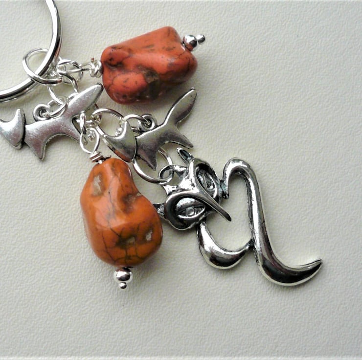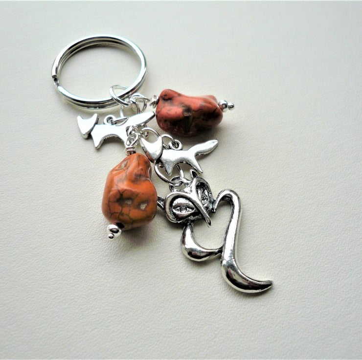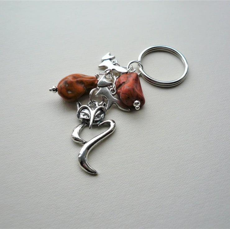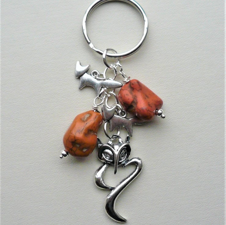 Fox themed keyring or bag charm made up of 18mm and 20mm rusty red orange Howlite nugget beads in a rich rusty orange colour teamed with Tibetan silver fox charms and 35mm long fox pendant hanging below. All attached to 25mm silver tone keyring and chain. Total length incl ring is approx 8.5cm.