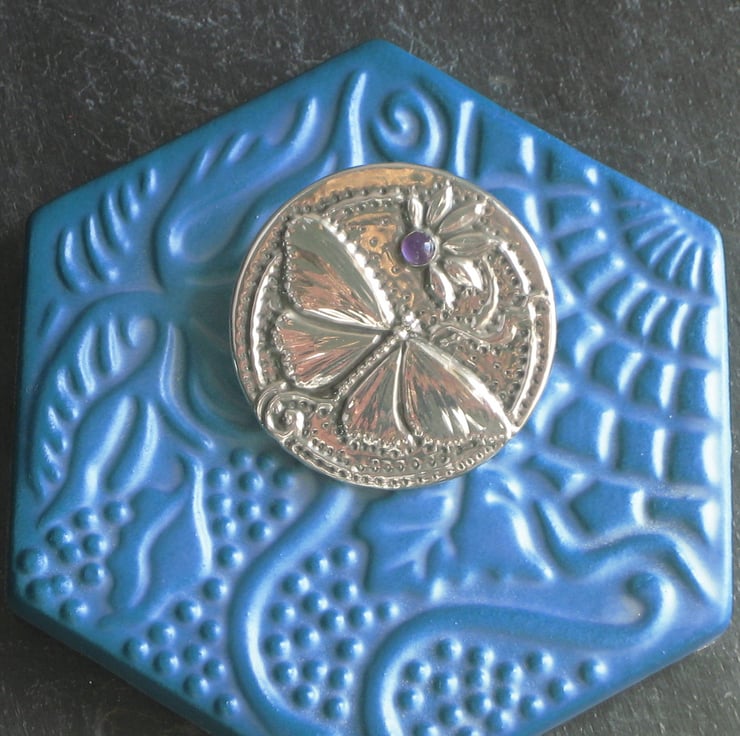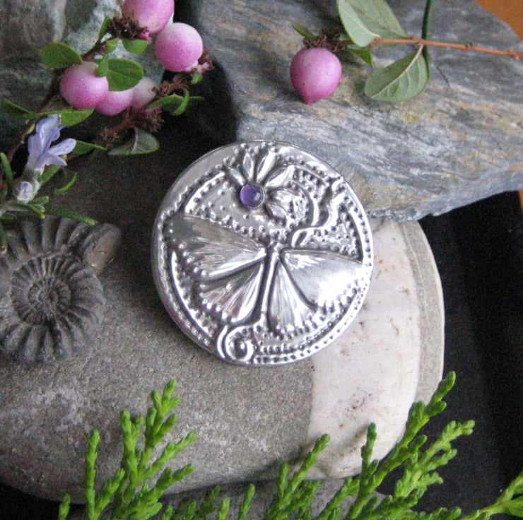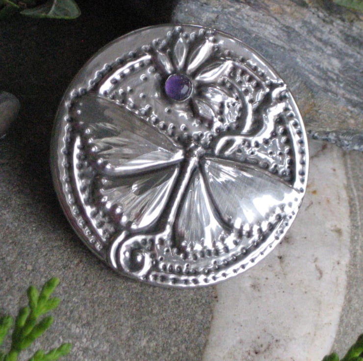 Butterfly amethyst brooch handmade in pewter. This beautiful shiny brooch has been handcrafted in the Arts and Crafts in lead-free pewter and features a genuine amethyst set in a design of a butterfly and daisy. The brooch measures 38mm across and has a 30mm pin with safety catch on the reverse. The brooch is light in weight for versatility of wear on a variety of fabrics and will be sent to you in a pretty gift box.