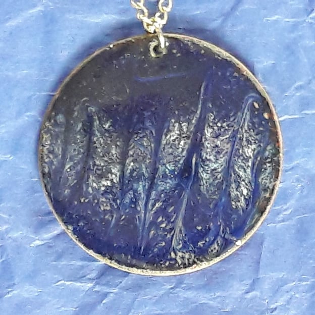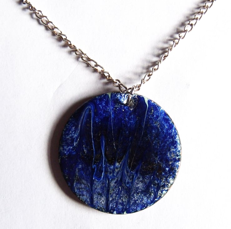 The pendant features a delicate white scrolled pattern over a deep blue background. The dark blue enamel is over a clear base and in some lights you will see the copper base shimmer golden brown.