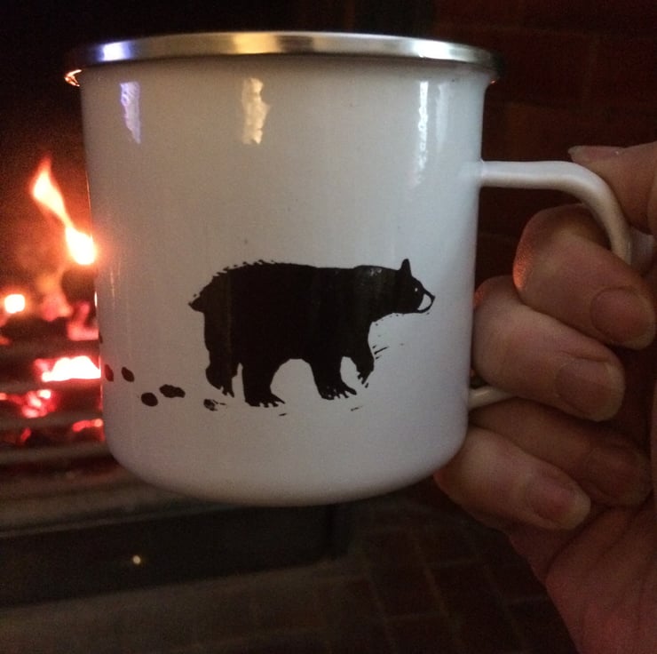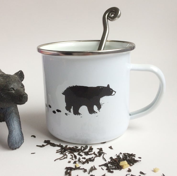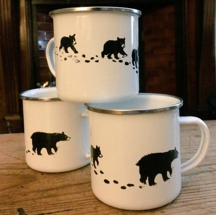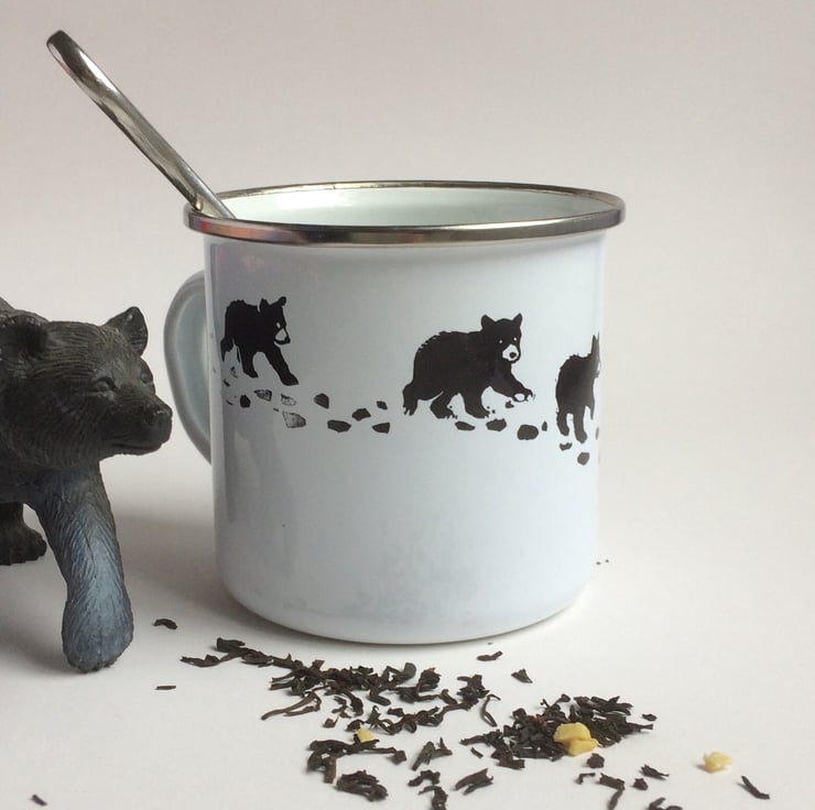 A lovely white enamel mug printed with the bear family from my 'Follow The Leader' linocut design and ready to fill with your fave hot drink. It's a generous 300ml capacity with a silver metal trim around the lip and will be sent bubble wrapped and boxed ready to give. A perfect present for those outdoorsy types and a great camping mug. Due to the nature of enamelled products, there may be slight unevenness and/or very minor marks. Dishwasher proof but best to hand wash. Limited supply, get your paws on one while you can!