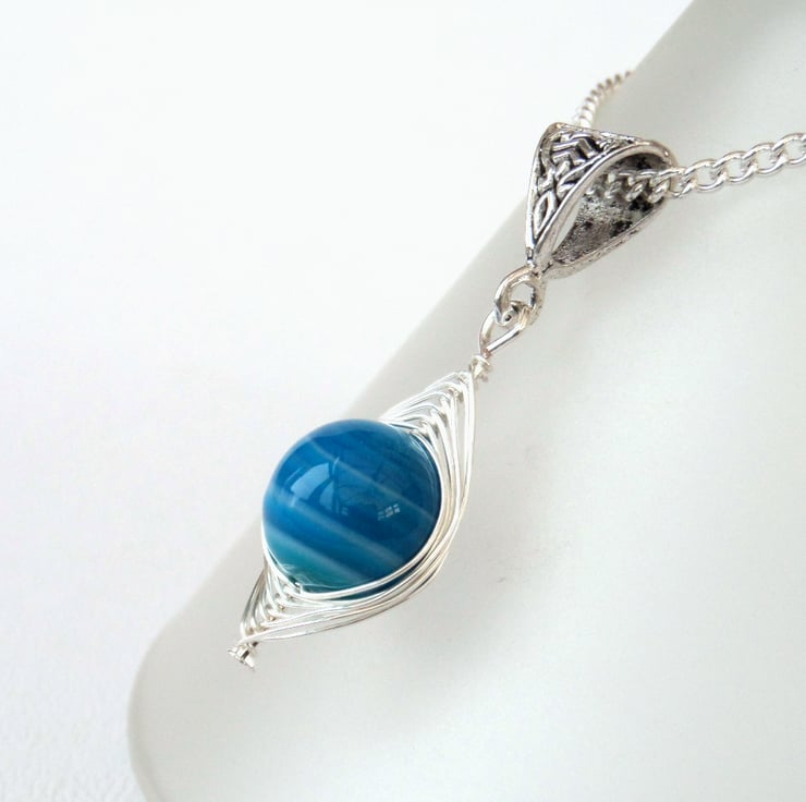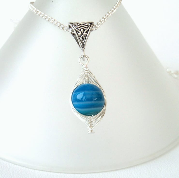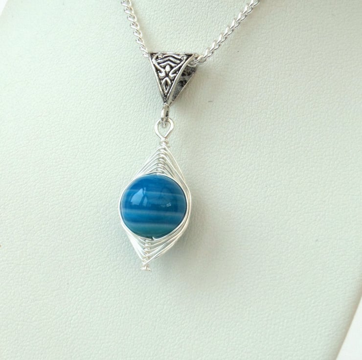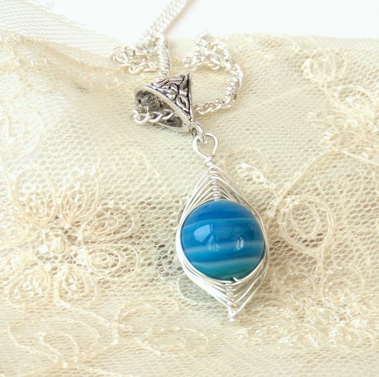 A beautiful and unique banded blue agate gemstone wrapped with anti-tarnish silver coloured wire makes a gorgeous pendant-style necklace.