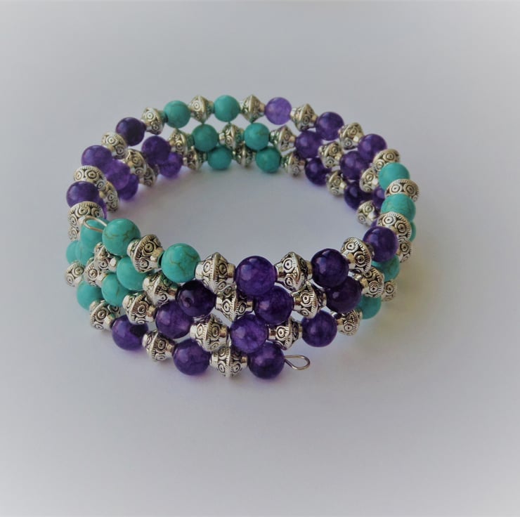 Memory wire bracelet made using purple and turquoise gemstone beads and Tibetan silver bicone spacer beads.