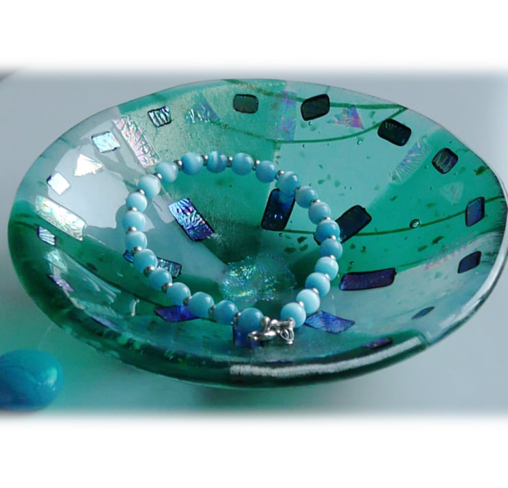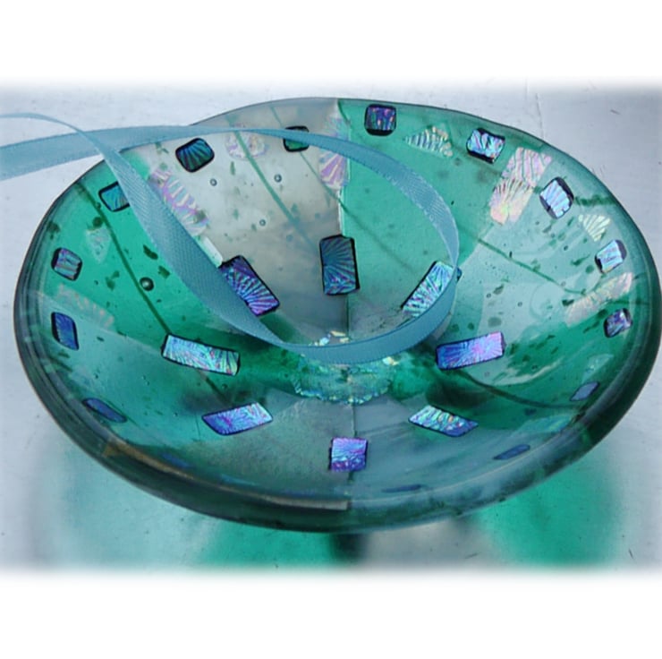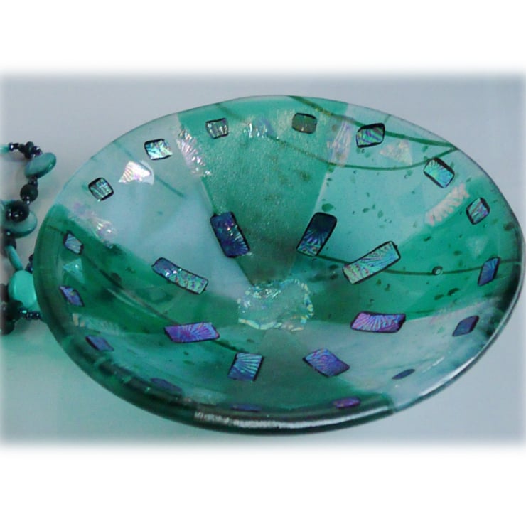 This round dish has a base of collage clear glass with green and aqua streaks. I've topped this with 4 types of teal and turquoise glass in 8 segments.