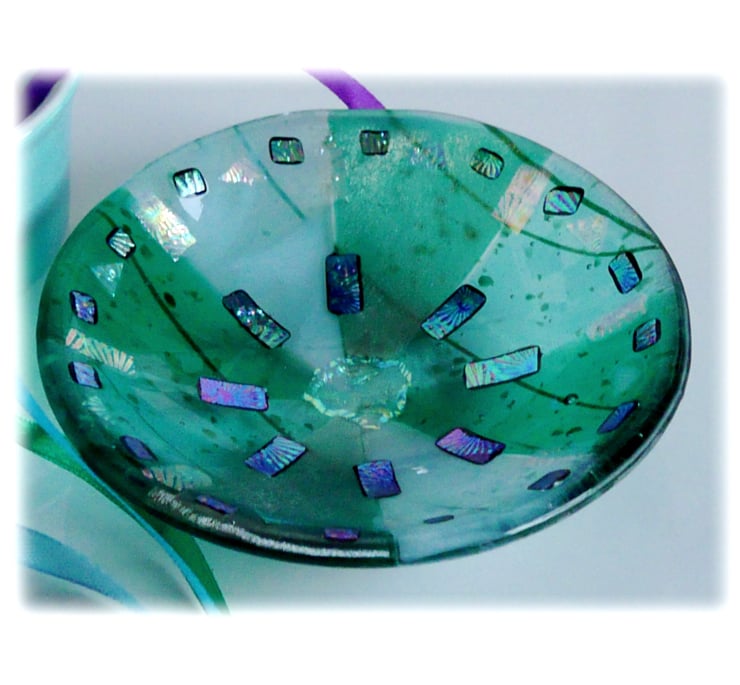 This is fused glass bowl, twice fired to very high temperatures in my kiln, first to fuse all the glass together as a flat circle, 2nd to slump it over a little mold into a dish.