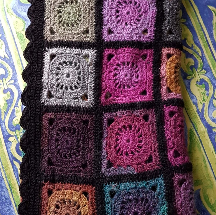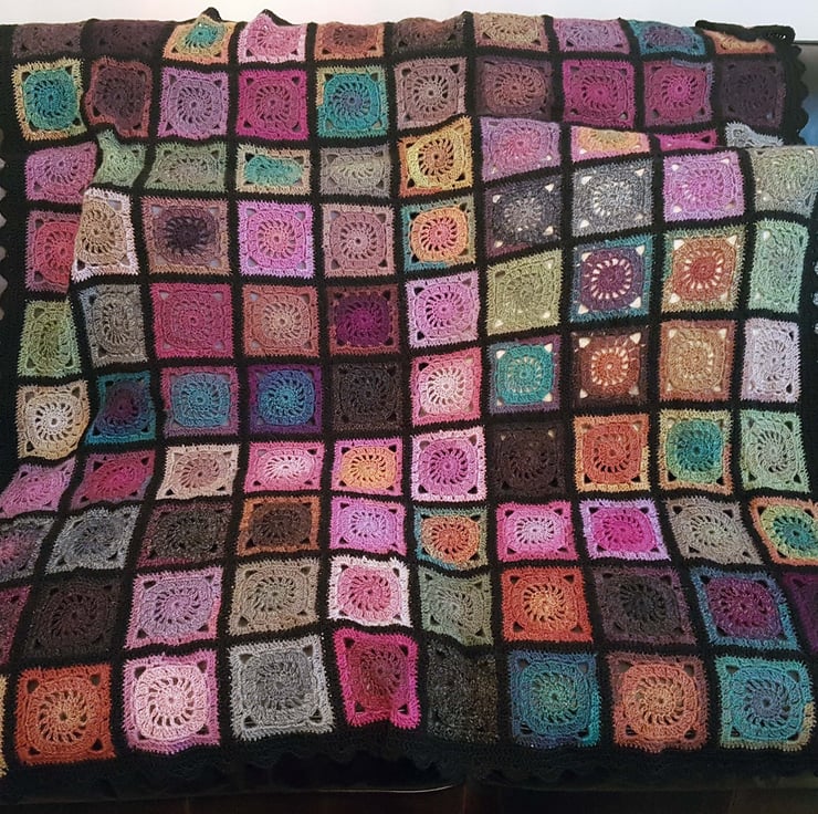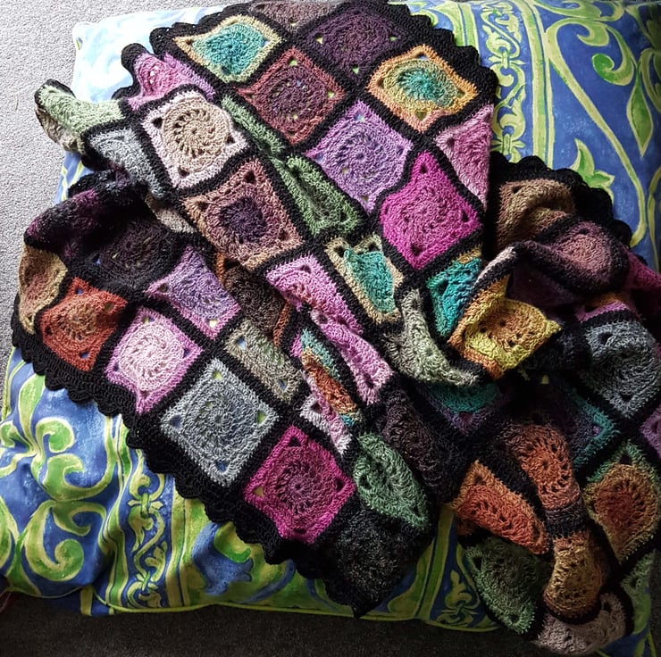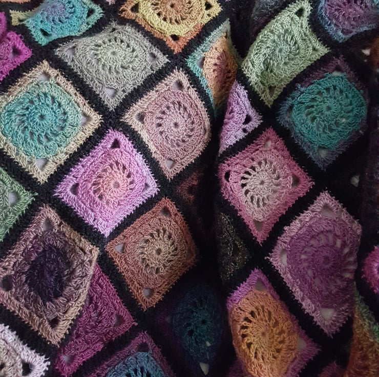 This is a lovely lightweight throw but because the yarn is 75% wool it still manages to be cosy and warm. Crocheted using colour changing yarn, the mix of colours, blends the 100 squares into a mosaic effect, hence the title.