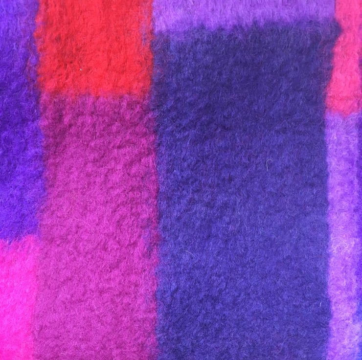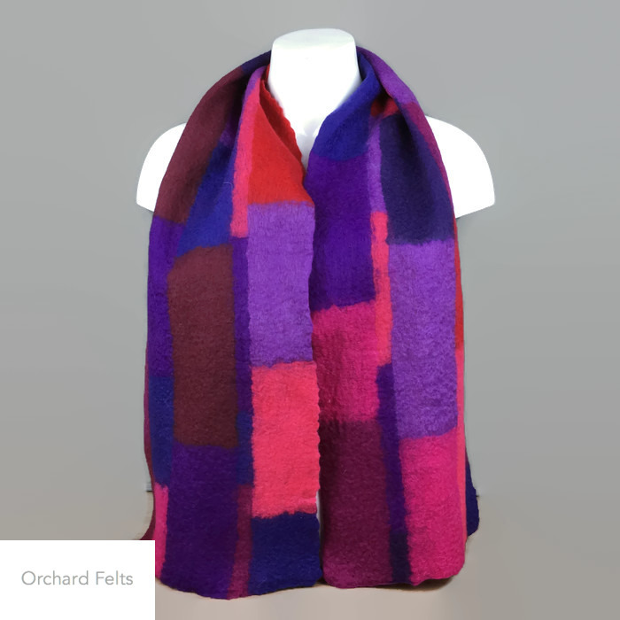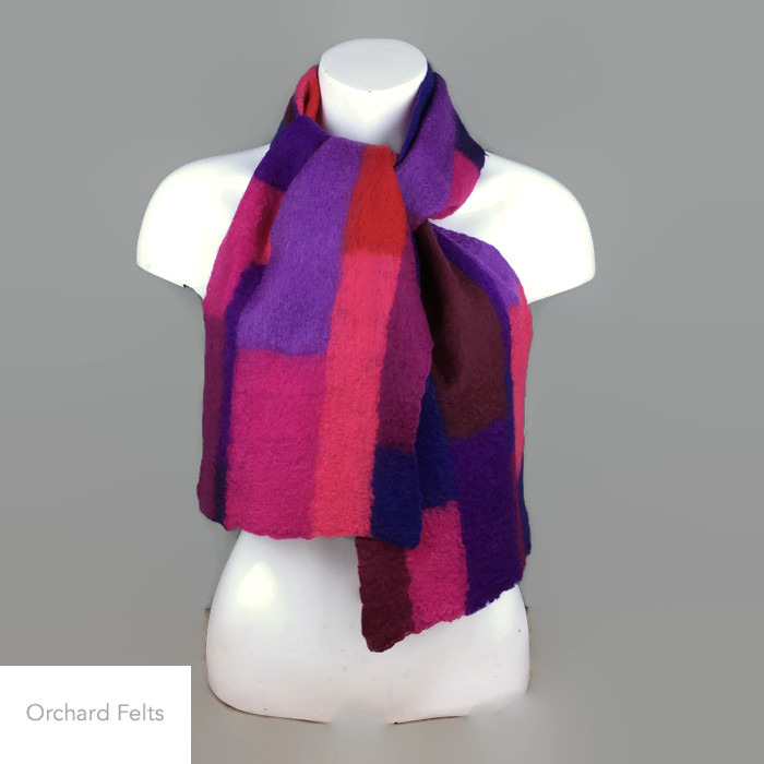 This wet felted scarf has been made from 100% merino wool fibres. Soft and warm, it has been constructed in a patchwork style from an array of rectangular sections of red, pink, purple and blue colours. The reverse is felted in a plain magenta colour although due to migration of the woollen fibres during felting the patchwork design is just visible.