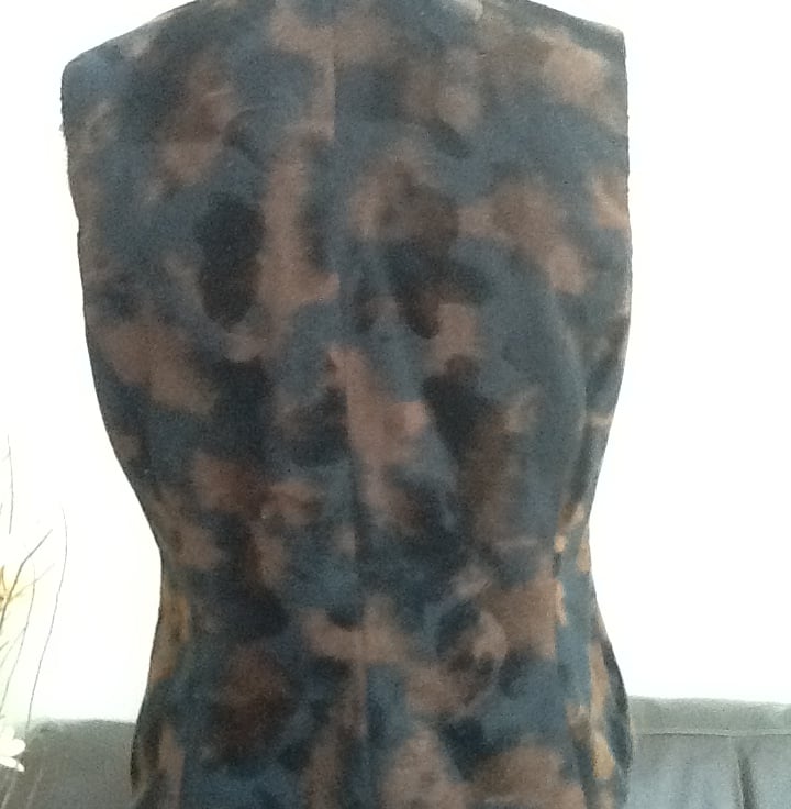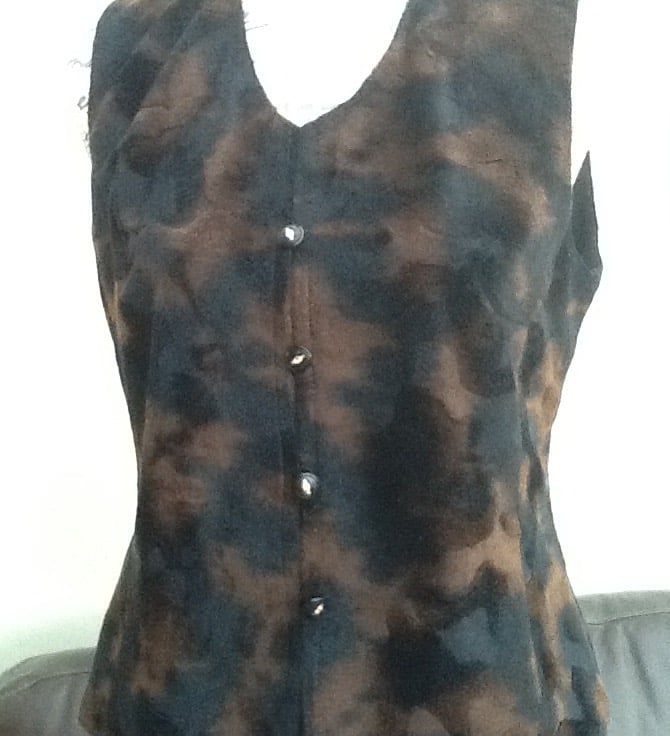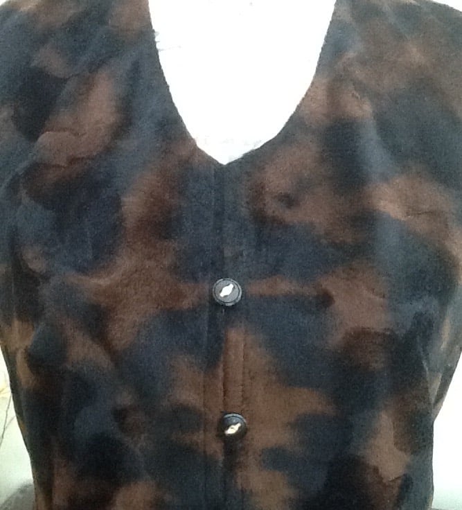 Velveteen Ladies Waistcoat in a hand made, one of a kind waistcoat, in a black and brown brushed velveteen like material, which is fully lined internally and has a four button closure.