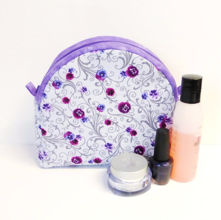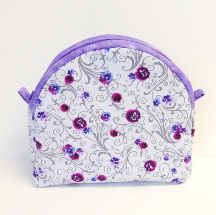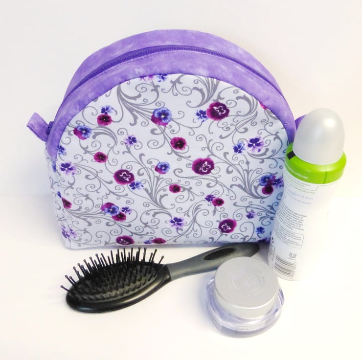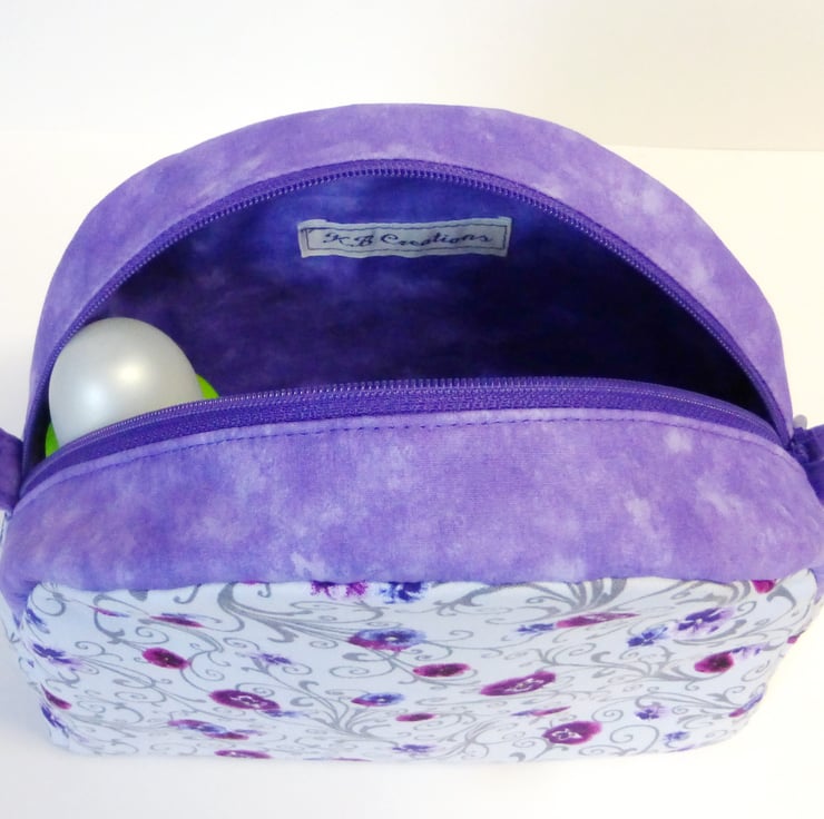 This is a large make up bag/toiletry bag, in a lovely rounded shape, made of a 100% cotton fabric in shades of purple and plum on a grey background, and a marble effect purple fabric for the zip section and the lining..