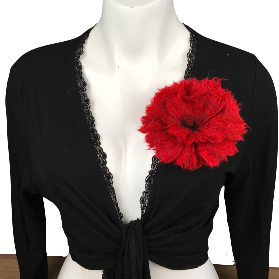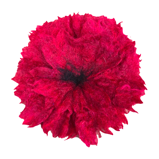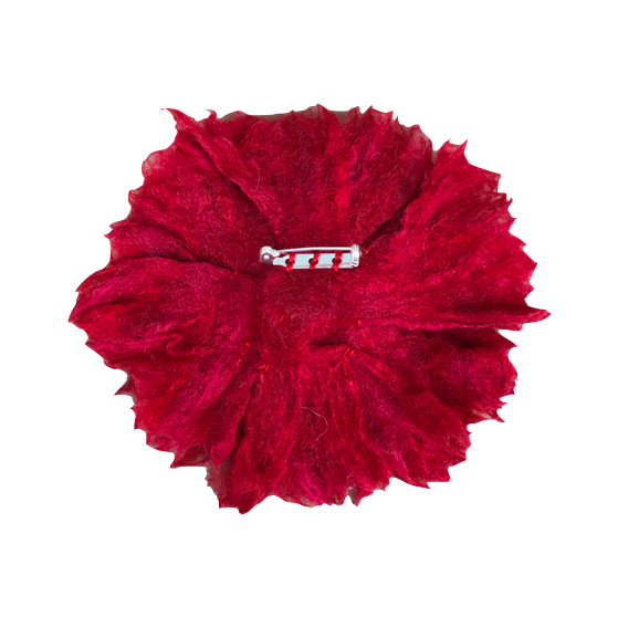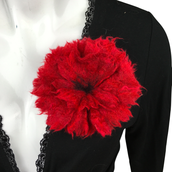 This stunning flower corsage has been hand felted using red merino wool with a black centre. The woollen fibres have been laid in four very fine layers to create light and wispy petals. The flower has then been shaped and a silver tone brooch pin has been sewn onto the reverse to create a gorgeous brooch or corsage. The brooch pin has been attached slightly offset form the centre to allow the flower to sit properly on the lapel. The flower measures approximately 12cm in diameter.