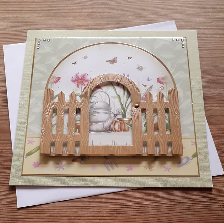 This luxurious card is ideal for all occasions shows a pretty spring garden viewed through a garden gate and would be a brilliant choice for Mother's Day or a garden lover or anyone celebrating a birthday, retirement, anniversary or new home