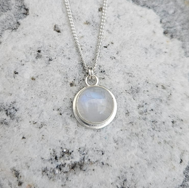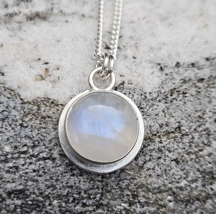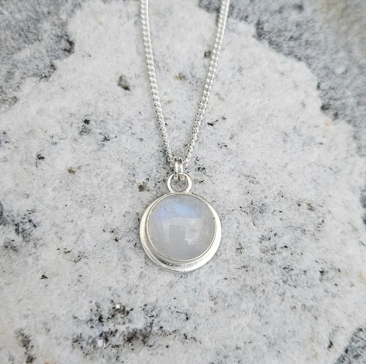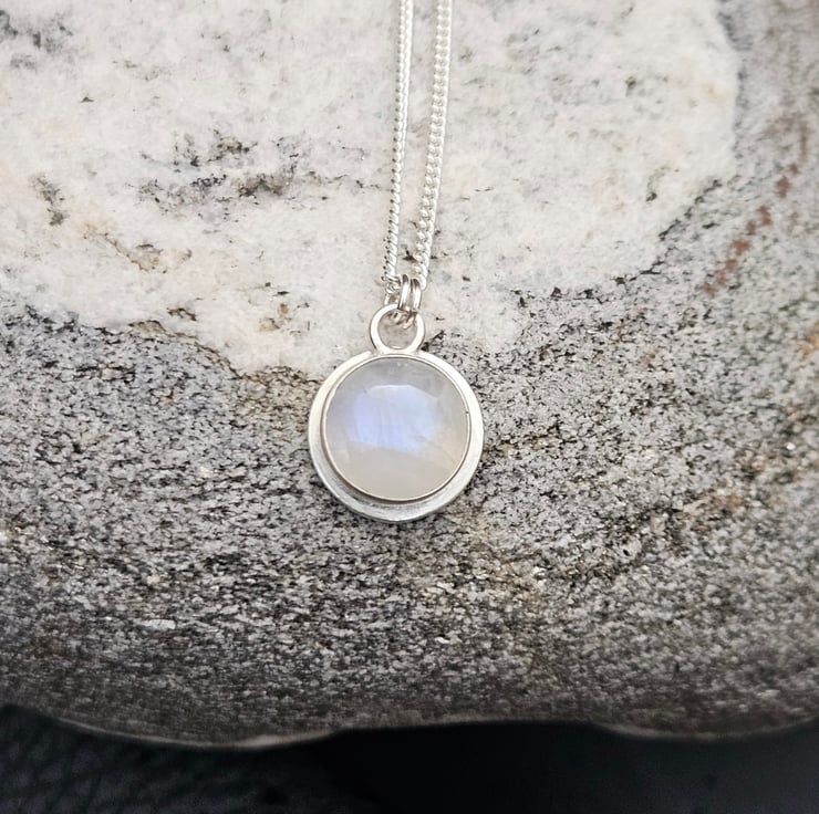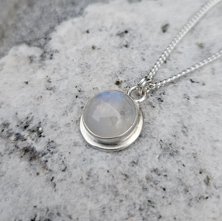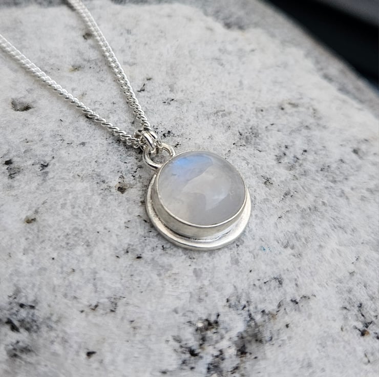 This sweet necklace is sterling silver holding a stunning 10mm blue flash Moonstone thats hard to photograph!