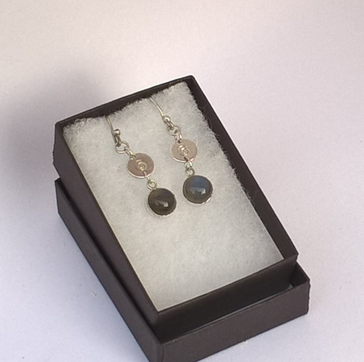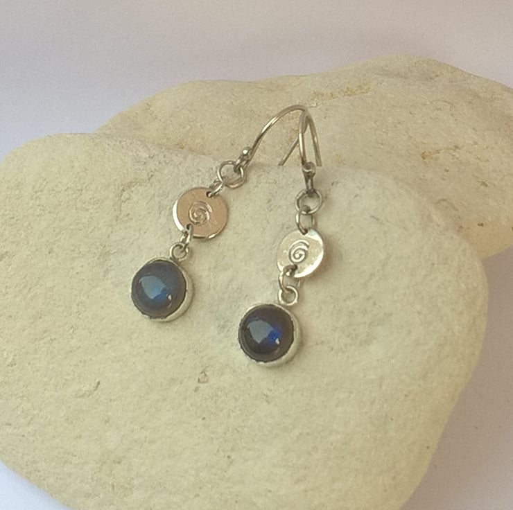 These dangley earrings are decorated with a small silver disc stamped with a swirl and then an 8 mm Labradorite cabochon suspended below it. Total drop is 27 mm. The stones change colour from dark to light blue with hints of grey.