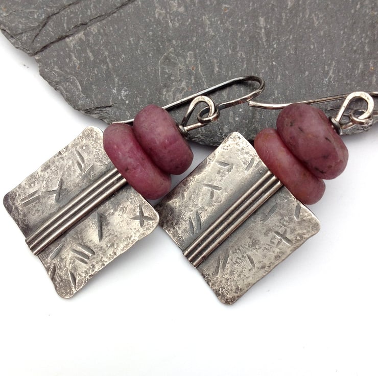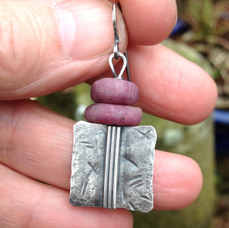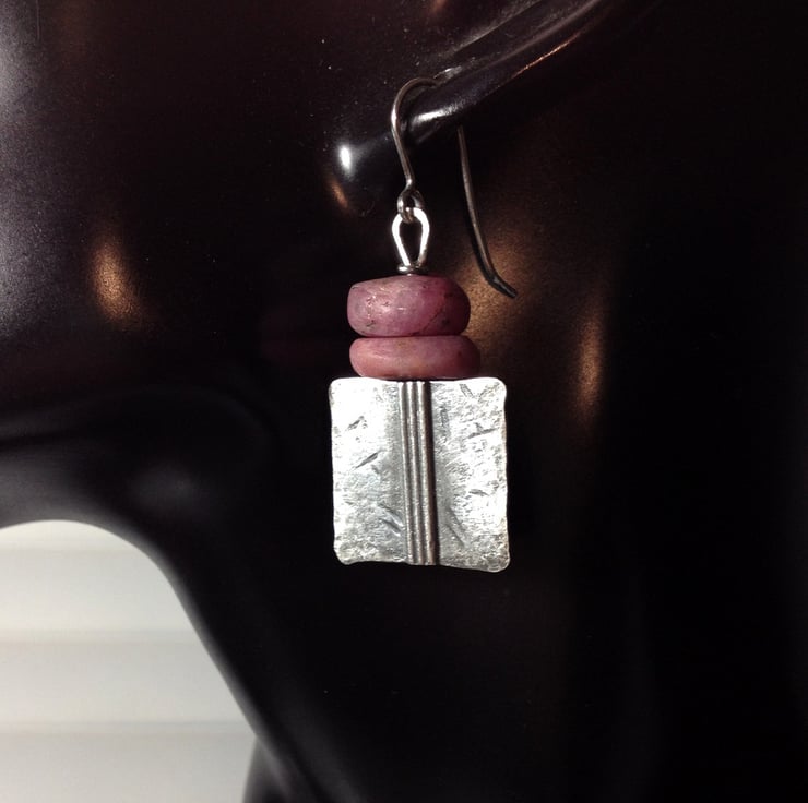 I have topped them with a pair of handcut matte pink ruby beads that add a nice weight and swing. The stones are irregular handcut rondelles, roughly matched for size and weight.