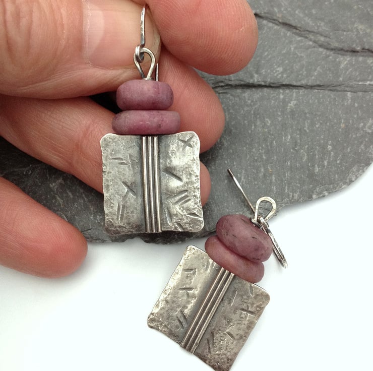 These sterling silver earrings have been beaten and fused for texture, they have an oxidised satin finish to highlight the texture and markings.